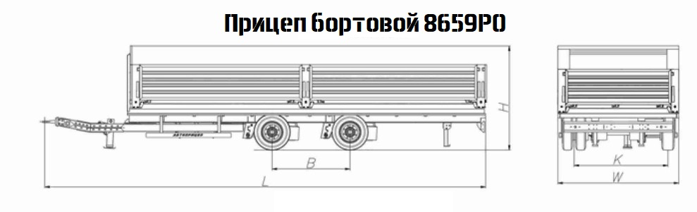 Параметры масс: Полная масса прицепа, кг До 10 000 Масса снаряженного прицепа, кг От 2500…4500 Масса перевозимого груза, кг От 3550 до 7000 (~5.8) Нагрузка на ось, кг, До 5 000 Прицеп бортовой «8659P0» с центрально расположенными осями предназначен, для перевозки различных грузов широкой номенклатуры и перевозка сыпучих и навалочных грузов. Прицеп производится компанией ООО «АВТОПРИЦЕП». Габаритные размеры прицепа: Длинна + дышло, мм От 4 000…12 000 Ширина, мм 2 000…2 550 Высота, мм ~ 800…4000 Внутренние размеры платформы(для примера): Длинна, мм …5270 Ширина, мм …2480 Высота, от пола до бота, мм …625 Подвеска: Тип Пневматическая, двухпроводная, с АБС или без (или тип с рессорной подвеской) Тип тормозных механизмов Барабанный Колесная база, шасси 1300..1500, 2/4 Оборудование транспортного средства: Устройства увязки; противооткатные упоры Наиболее часто прицеп используется в комплектации: каркас, передняя стенка, задние распашные ворота, тент. по заказу: тент; каркас с тентом; откидные борта; передняя стенка; боковые двери; задняя дверь; запасное колесо; ящик инструментальный; дополнительные опоры; дышло регулируемое по вылету; уширители; съёмные борта; аппарели; шторный механизм тента; сдвижная крыша; задние распашные ворота; передние распашные ворота; трапы За дополнительную плату.